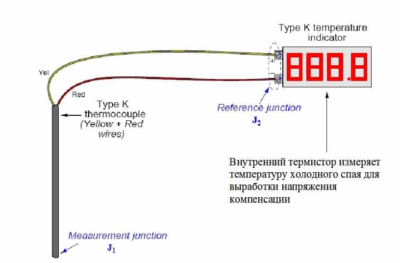 Находящийся в точке измерения температуры спай называется «горячим», а место подключения проводов к преобразователю — «холодным».