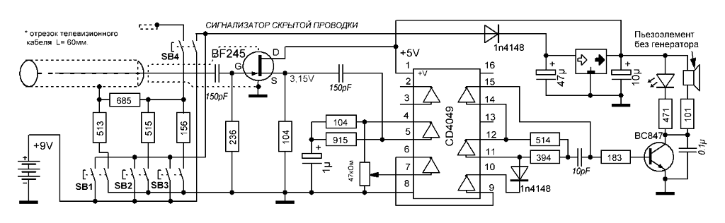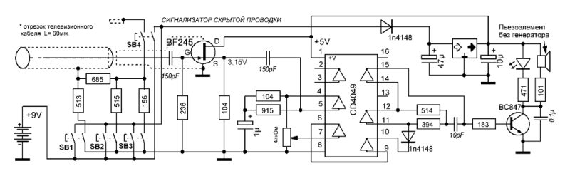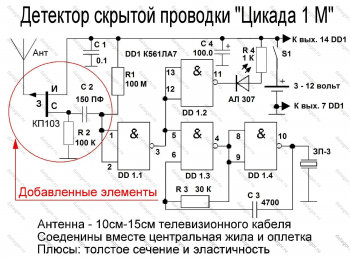 ↑ Доработанная схема детектора скрытой проводки