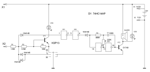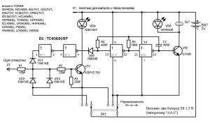 - Генератора импульсов продолжительностью до секунды на базе двух логических элементов цифровой микросхемы простейшей логики 561ЛЕ5 (D1 1; D 1 2);