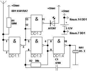 - Генератора звуковой частоты на двух оставшихся элементах микросхемы;