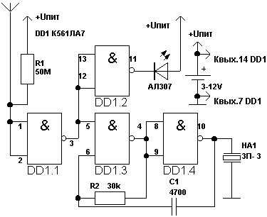 Это устройство может питаться от батареек напряжением от 3 до 12 В. Для ограничения тока использован резистор R1, сопротивление которого не должно опускаться ниже 50 МОм. Но для светодиода (обозначен АЛ307) такого резистора не предусмотрено: он не нужен, потому что используемая микросхема (К561ЛА7) сделает все сама.