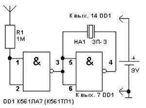 ) такого резистора не предусмотрено: он не нужен, потому что используемая микросхема (К561ЛА7) сделает все сама. При приближении искателя к проводу под напряжением будет слышен не только шум, но и будет загораться светодиод. Двойная индикация надежнее.