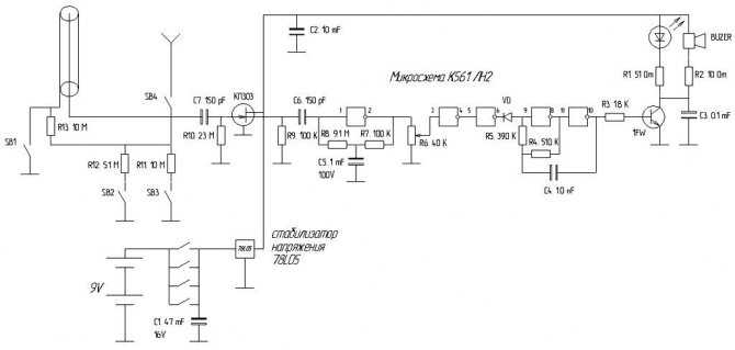 Данный бесконтактный индикатор скрытой проводки базируется на микросхеме К561ЛА7. Чтобы уберечь ее от высокого напряжения, созданного статическим электричеством, потребуется резистор в 1 МОм (на схеме R1). Питается устройство от кроны (9В). В качестве антенны подойдет медная проволока или любой металлический стержень длиной от 5 до 15 см. Золотая середина – 10 см