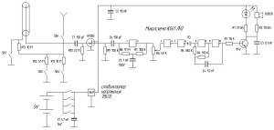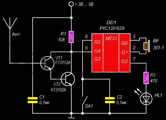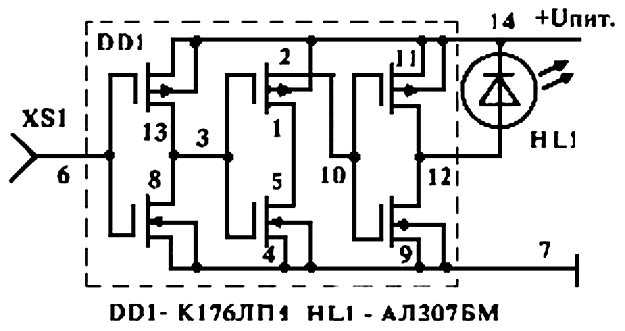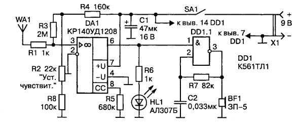 К его входу подключена антенна, на выходе установлен второй светодиод HL 2. При наличии наводки (сигнала) на антенне усилитель поднимет его уровень и зажигает подключенный светодиод.