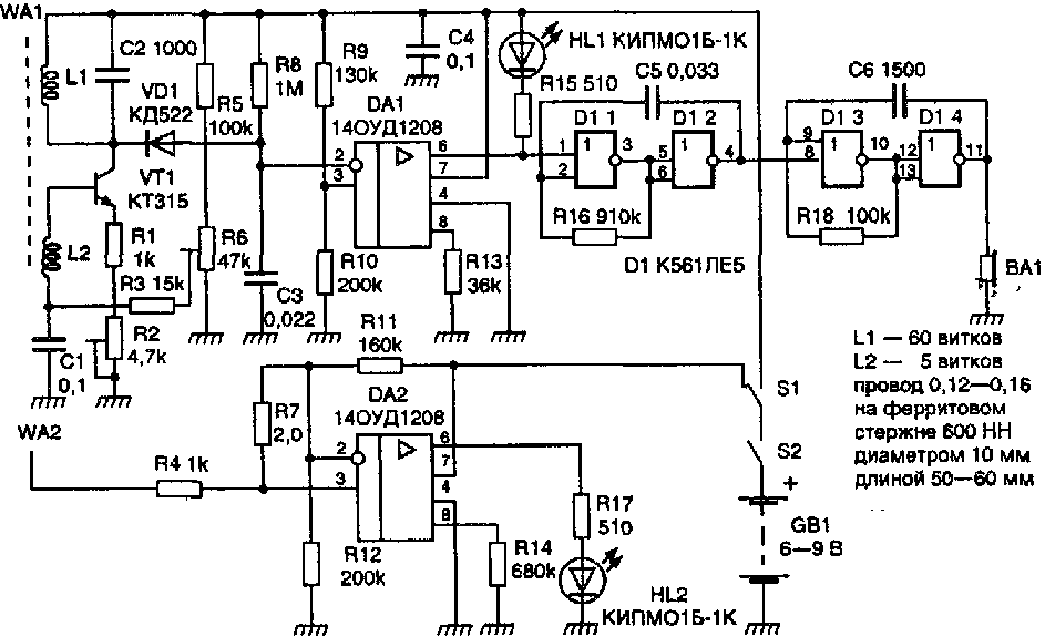 Основная часть прибора состоит из двух усилителей КР140УД1208. В данном случае не используется звуковой сигнализатор. Транзистор КТ315 применяется для создания генератора высоких частот, а переменное сопротивление R6 помогает ему перейти к режиму возбуждения. Сигнал на выходе генератора выпрямляется за счет диода КД522. Компаратор, созданный на базе усилителя КР140УД1208ОУ, при помощи этого сигнала переводит генератор звуковых сигналов (К561ЛЕ5) в режим ожидания. При этом светодиод гаснет.