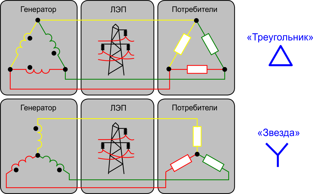 В простейшем случае каждую обмотку можно подключить к своему потребителю и получить три изолированные и практически независимые системы электропитания. Однако в этом случае теряются все преимущества трехфазного напряжения, поэтому все три обмотки соединяют вместе. Различают два способа соединения: «треугольником», когда начало одной обмотки соединяется с концом другой, и «звездой», когда начала обмоток соединяются вместе, а соединительные провода подключаются к концам обмоток (Рисунок 11). Достоинства и недостатки каждого из способов соединения взаимно компенсируют друг друга, поэтому энергетики, за исключением «последней мили», одинаково часто используют оба способа. Более того, трехфазная система позволяет смешивать оба типа соединений, например, обмотки генератора могут быть соединены по схеме «треугольник», а потребители – по схеме «звезда».