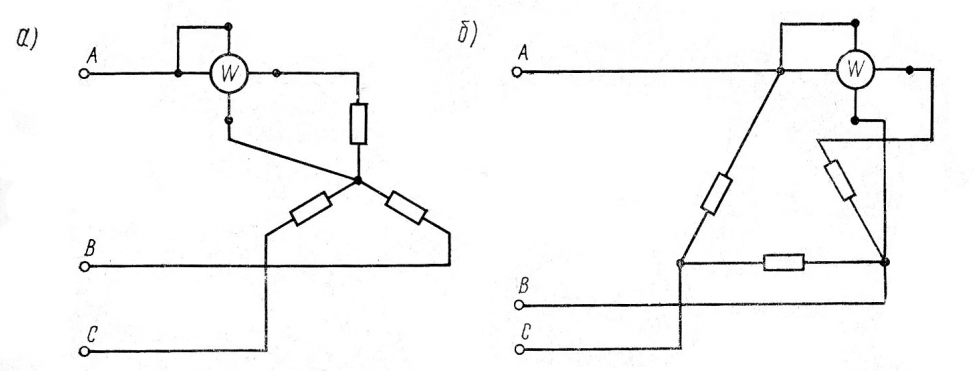 Электрическая мощность измеряется специальным прибором – ваттметром. Ваттметр имеет две обмотки (катушки): последовательную и параллельную. Последовательная катушка является токовой и включается последовательно с нагрузкой на участке цепи, где производятся измерения, а параллельная катушка – это катушка напряжения, она соответственно включается параллельно этой нагрузке. Принцип действия ваттметра основан на взаимодействии двух магнитных потоков создаваемых током, протекающим по обмотке подвижной катушки (токовой катушки), и током, проходящим по неподвижной катушке (катушке напряжения). При прохождении измеряемого тока по обмотке подвижной и неподвижной катушек образуются два магнитных поля, при взаимодействии которых подвижная катушка стремится расположится так, чтобы направление ее магнитного поля совпадало с направлением магнитного поля неподвижной катушки. Вращающему моменту противодействует момент, созданный спиральными пружинками, через которые в подвижную катушку проводится измеряемый ток. Противодействующий момент пружинок прямо пропорционален углу поворота катушки. Стрелка, укрепленная на подвижной катушке, указывает значение измеряемой величины. Схема включения ваттметра показана на рисунке 2.