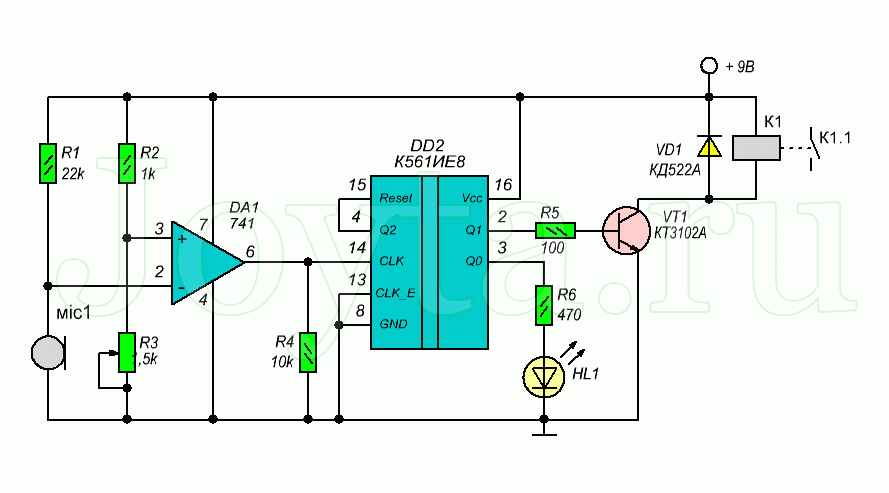Собрать простой акустический выключатель по хлопку можно своими руками, он состоит из следующих деталей: