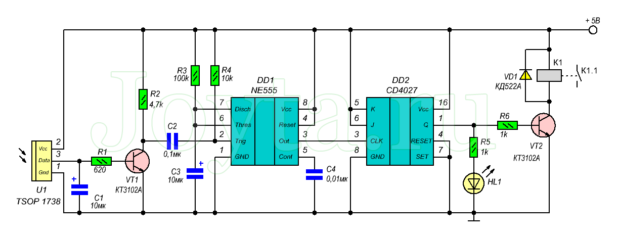 С выхода транзистора VT1 усиленный сигнал запускает ждущий мультивибратор на таймере NE555 . Импульс с выход (3) таймера, имеющий длительность в 1 секунду, переключает JK-триггер, чей выход (1) через транзистор (VT2) управляет электромагнитным реле. С каждым новым сигналом от NE555, выход JK-триггера будет изменяться на противоположное состояние.