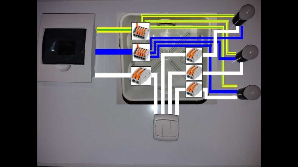 Как стало известно из практики, монтаж такой схемы требует использования увеличенной коробки или спаренного её аналога. Это в первую очередь обусловлено тем, что в стандартном распределительном коробе попросту не хватит места для качественного соединения проводов или же из-за большого количества соединительных колодок не удастся закрыть крышку.