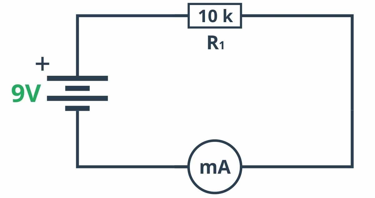 Проверим на практике, действительно ли «работает» закон Ома. Возьмем батарейку или аккумулятор напряжением около 9 вольт. Нам нужно узнать, какой ток будет протекать, если мы замкнем цепь, подключив к ней резистор 10 кОм. Кружок с надписью «mA» на схеме обозначает наш мультиметр (тестер), настроенный на измерение амперов.