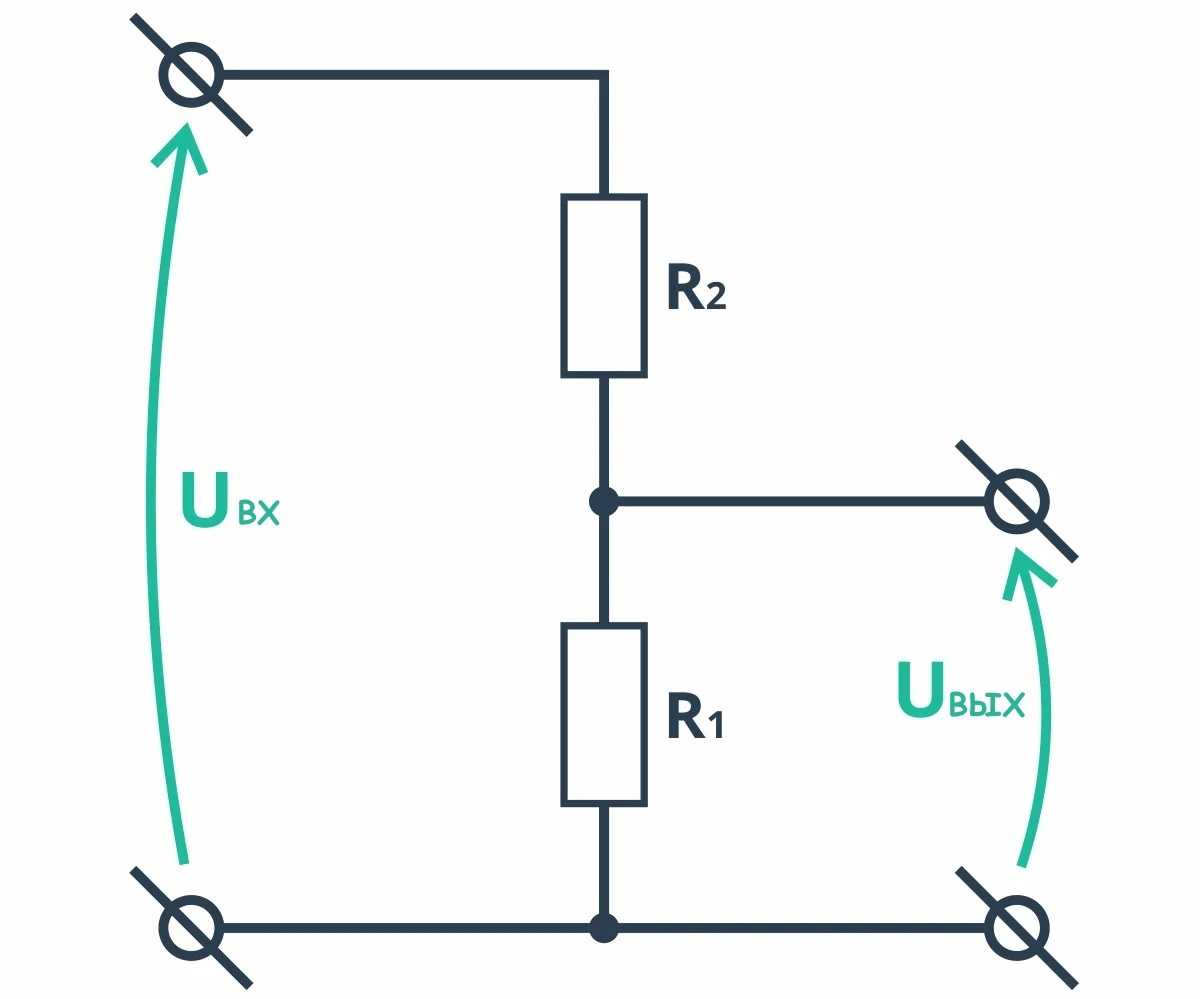 Делитель напряжения — не что иное, как одно из практических применений вышеуказанных законов. На практике все очень просто — последовательно соединяем два резистора и запитываем их.