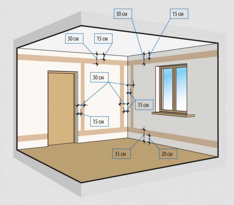 - кабель нужно монтировать на расстоянии в 0.15 метра от потолка и 0.1 метра от дверей и окон;