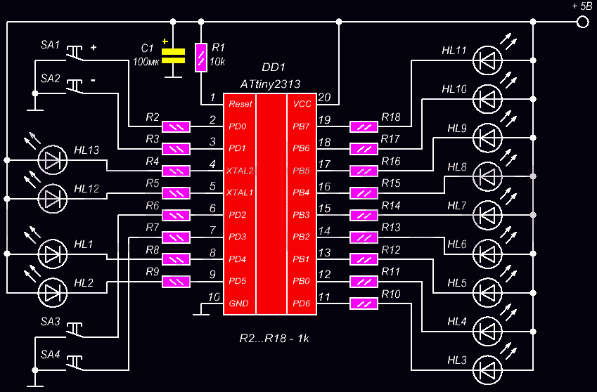 Эта конструкция способна осуществлять управление тринадцатью светодиодами, которые подсоединены через токоограничивающие резисторы