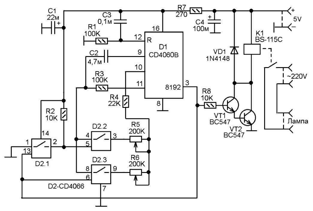 Диодами VD1-VD7 коэффициент деления счетчика ограничен значением 2048+512+256+128+32+16+8=3000, что при входной частоте 50 Гц на выводе 1 микросхемы дает импульсы с периодом в одну минуту.
