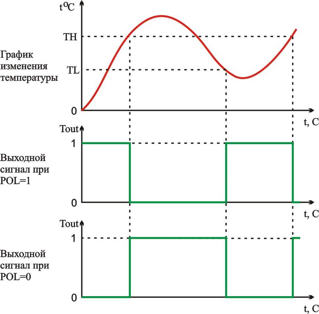 , устанавливаемый в зависимости от значения температуры. Пороги включения и выключения выхода задаются значениями в регистрах TH