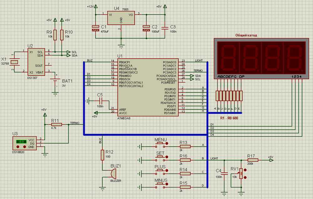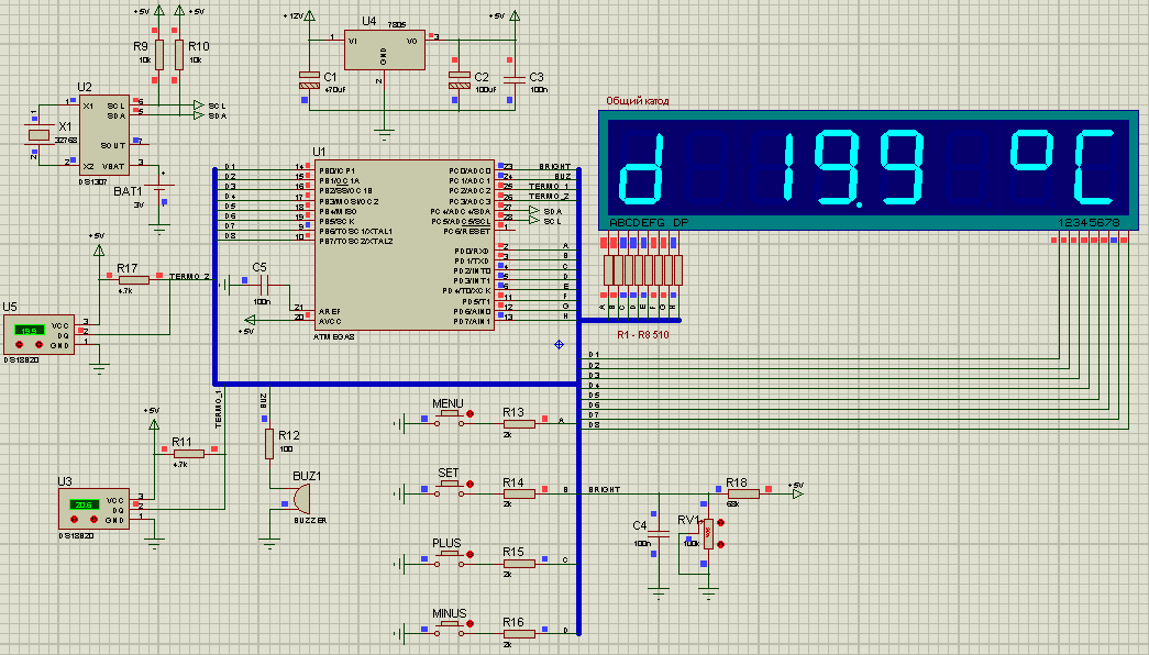 Индикаторы используются с общим катодом. Сегменты обоих индикаторов соединены между собой, а управление осуществляется с помощью динамической индикации