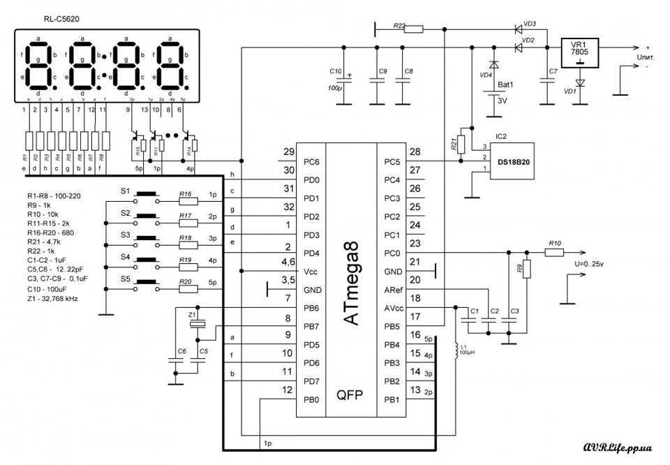 Обратите внимание, что десятичные точки индикаторов также используются. Более подробно об этом позже. Питание осуществляется переменным напряжением 9В, снимаемым со вторичной (или двух вторичных) обмотки трансформатора. Далее напряжение выпрямляется с помощью диодного моста В1 и сглаживается на конденсаторе С2. Выпрямленное и сглаженное напряжение поступает на вход линейного стабилизатора 5В