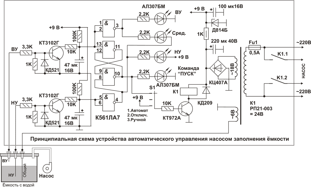 Контроллер уровня воды | Полная принципиальная схема с пояснениями