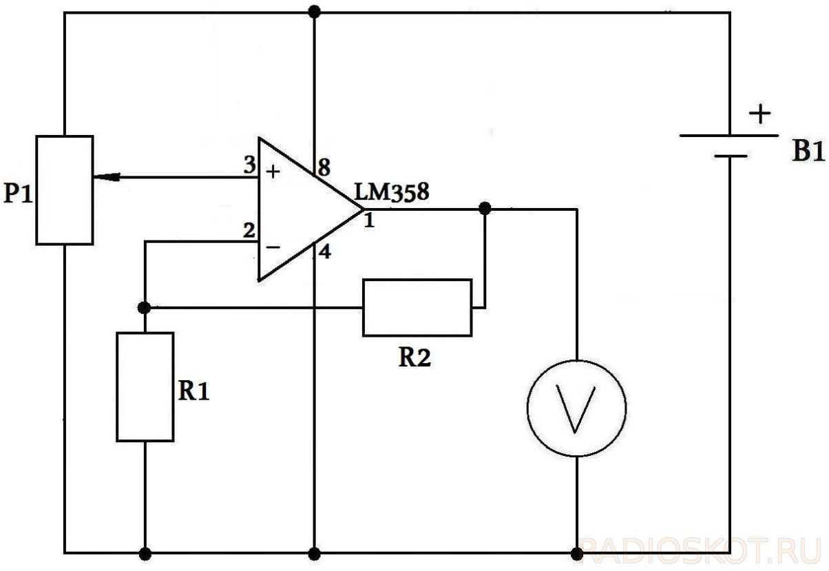 Схема стабилизатора, используемая в нашем собираемом зарядном устройстве, довольно проста и основана на базе операционного усилителя (ОУ) без обратной связи с большим коэффициентом усиления.