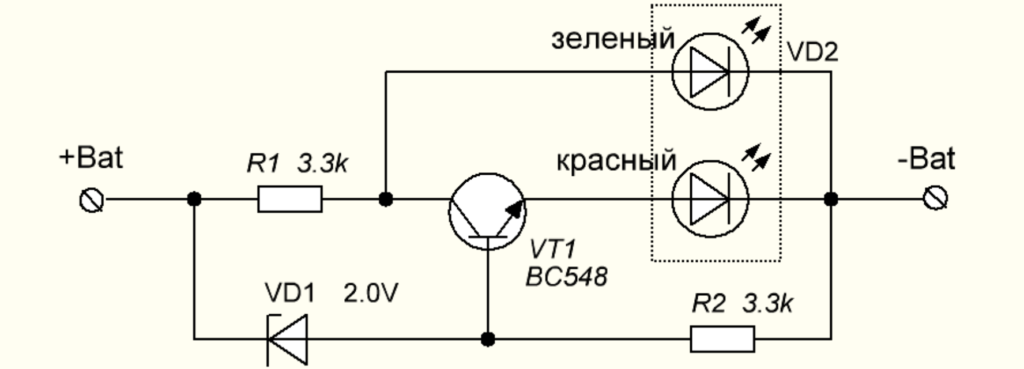 В электрической схеме контроля уровня заряженности аккумулятора на 12 Вольт не содержится ни стабилитронов, ни сложных микросхем, ни транзисторов. Она состоит из включенных последовательно резисторов и светодиодов.