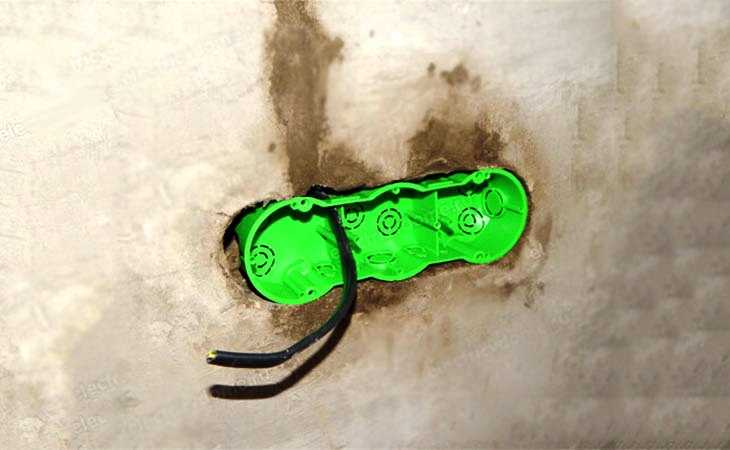 После фиксации подрозетника аккуратно обрезается его выступающий участок — таким образом, элемент будет утоплен на нужную глубину и окажется на одном уровне с бетонной, кирпичной стеной. Конструкция будет выглядеть аккуратно Для подключения к подрозетнику провода выполняется штроба — она должна располагаться вверху. Сделать ее легко при помощи перфоратора или даже обычной стамески — зависит от особенностей материала, из которого выполнена стена