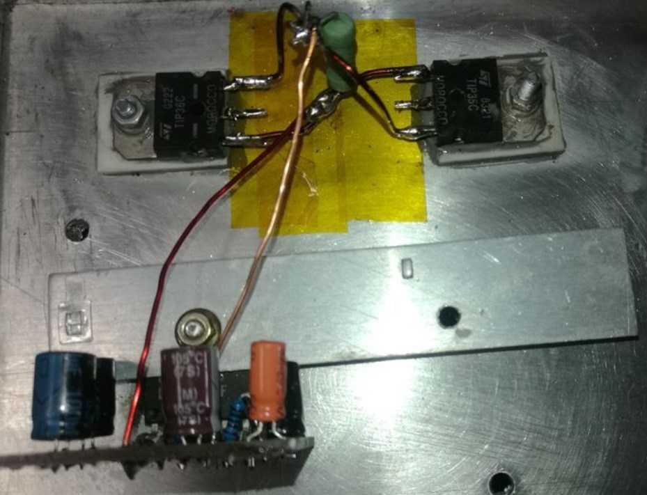 Схема, которую решено было испытать, работала нормально долгое время, без перегревов и срабатывания защит. И даже 4 транзистора могут быть добавлены под 200 ваттный громкоговоритель 4 Ом, в принципе и 400 Вт может быть снято. Не забудьте только использовать изоляцию в радиаторе, в сборке транзисторов и интегральных микросхем.