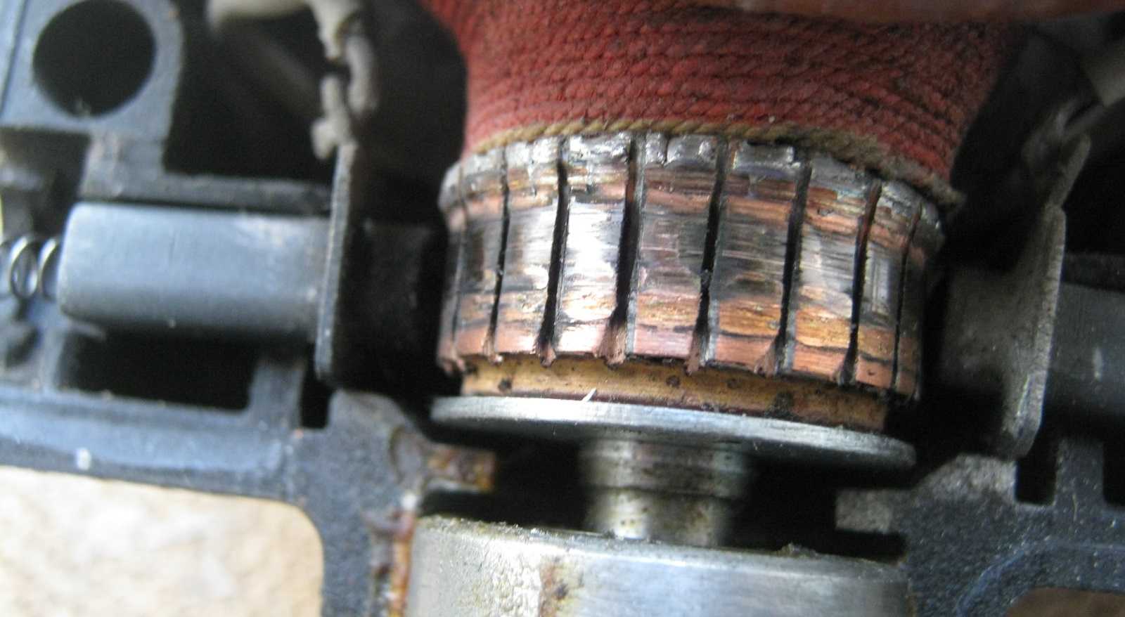 При длительной эксплуатации щетки протирают в ламелях коллектора впадины. Также ламель может отслоиться, потому что замкнул или заклинил ротор. Понять это вы сможете во время визуального осмотра. Если наблюдаются заусенцы, неровности, якорь снимается и устанавливается на токарный станок для проточки.