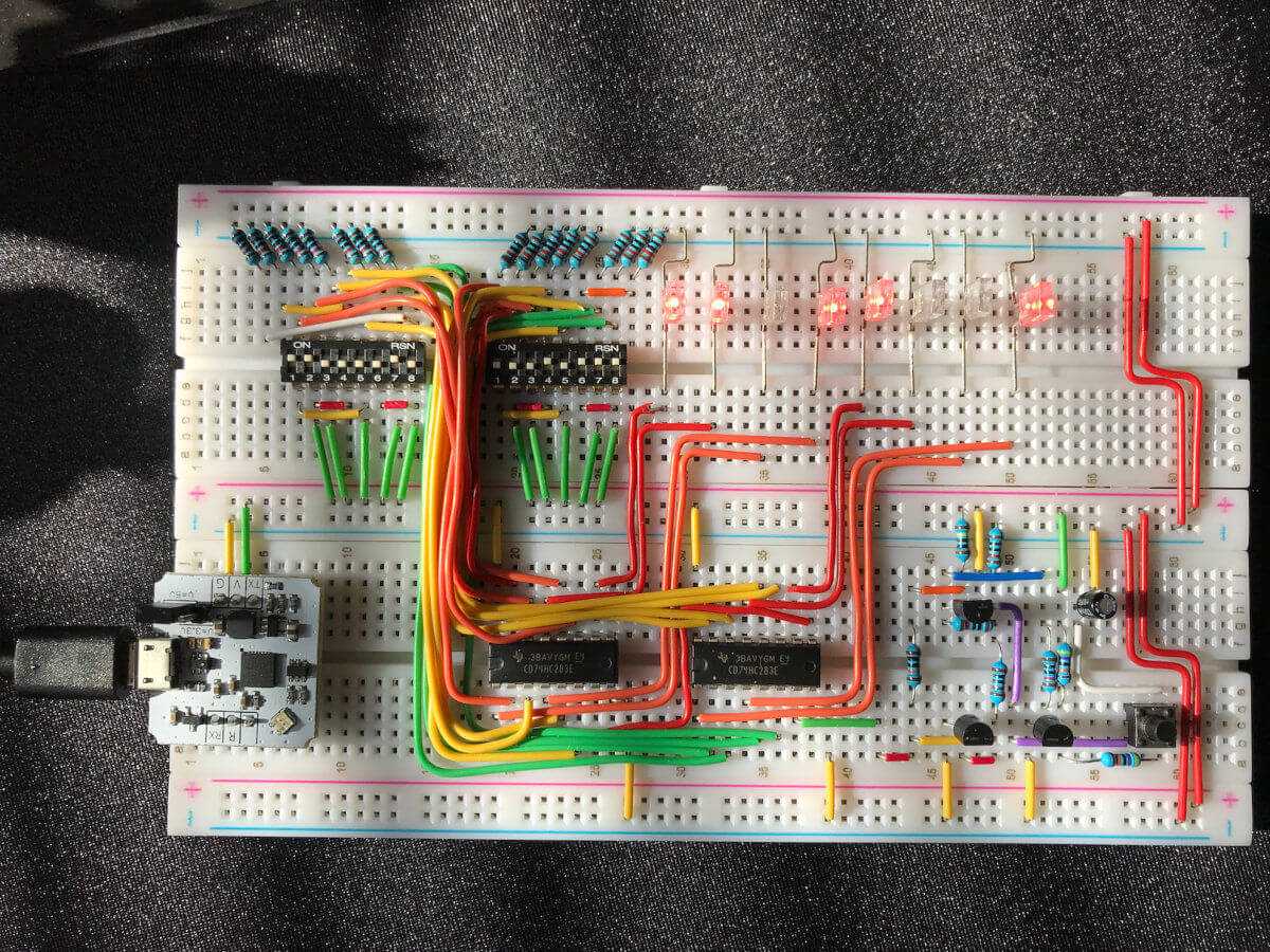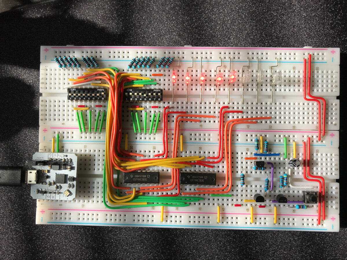 Как правило, значения в АЛУ попадают из регистров — самого быстрого типа памяти в компьютере. Здесь же я для удобства использую пару DIP-переключателей (левый верхний угол), чтобы можно было легко задавать нужные значения. По сути, это регистры А и В нашего протокомпьютера.