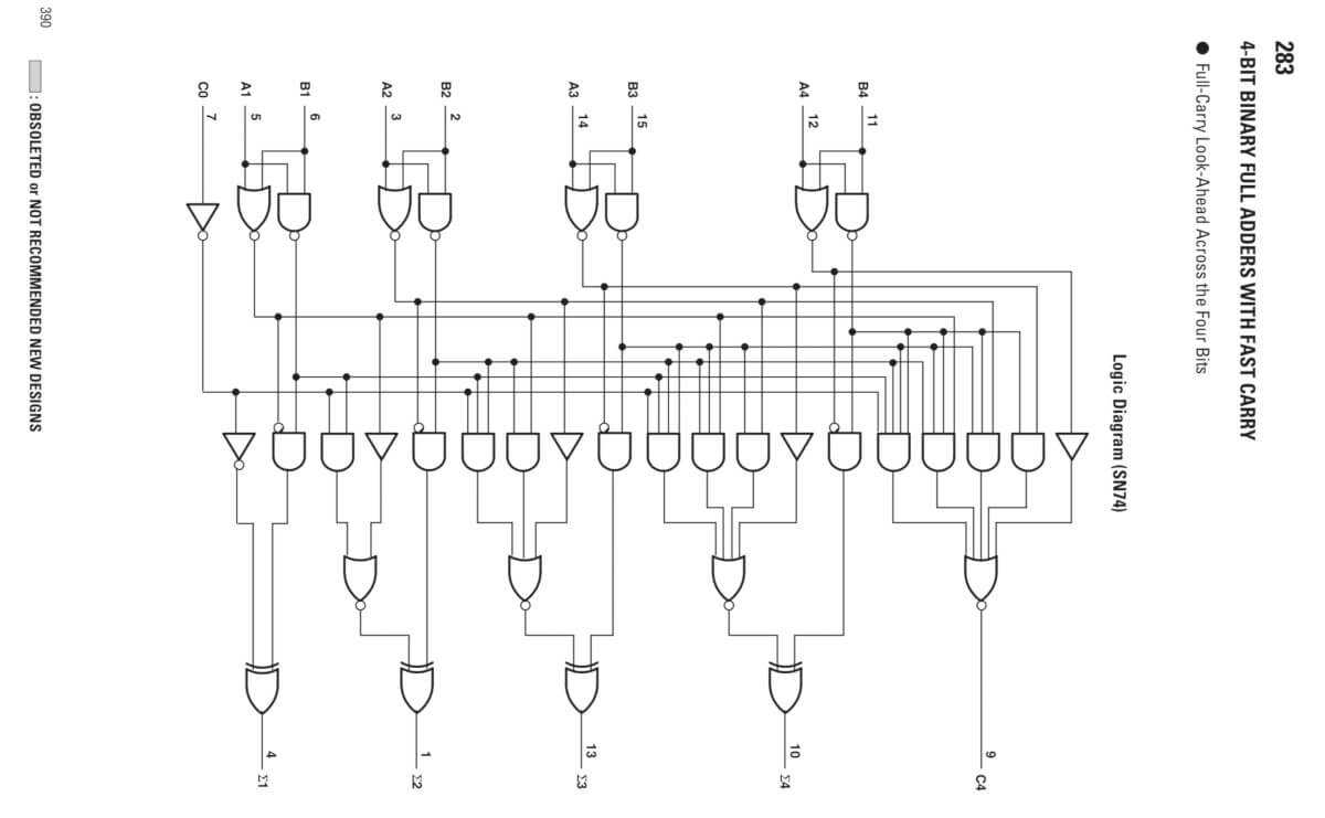 Расположение выводов у микросхемы 74HC283 можно найти на странице 176 справочника, принципиальную схему и таблицы истинности смотри на страницах 390–391. И хотя это сумматор всего лишь на четыре бита, тут есть функция ускоренного переноса, а сами микросхемы можно объединять, собирая сумматоры на 8, 16 или даже 32 бит.