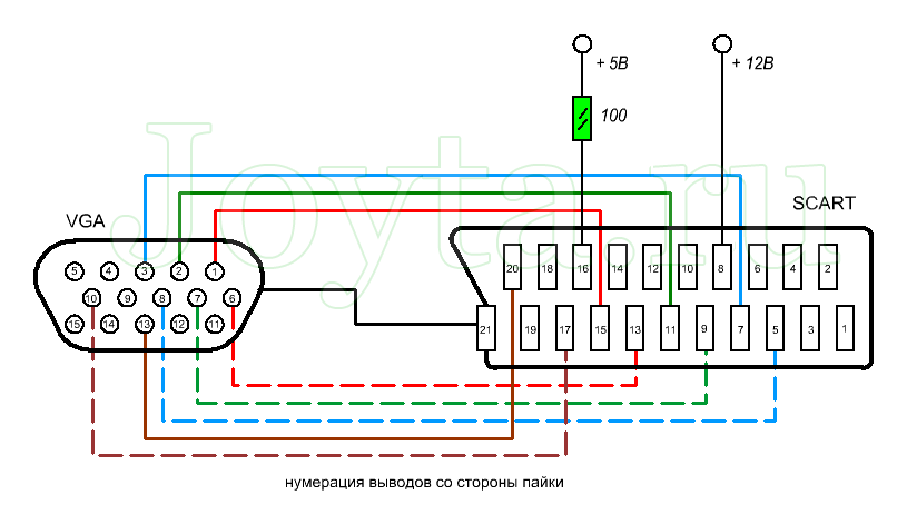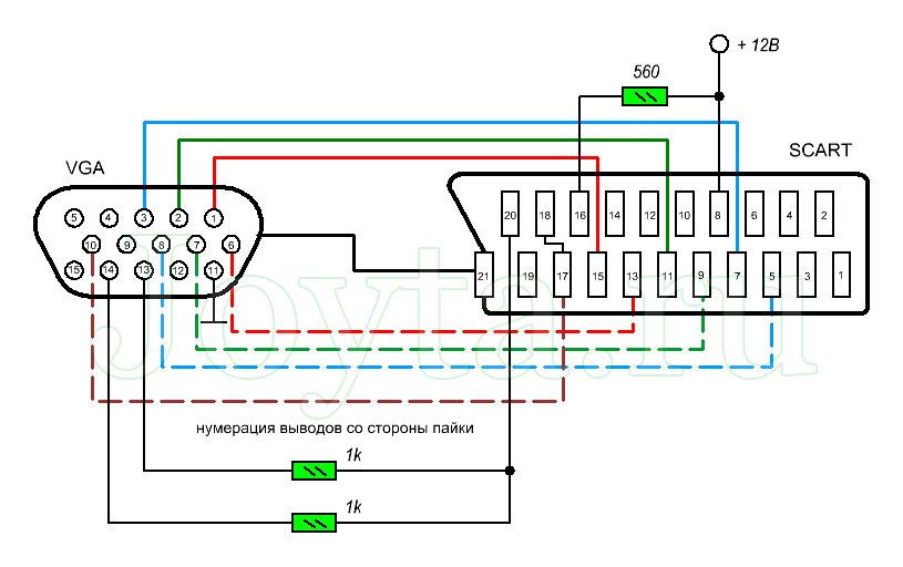 В основном используются три линии RGB (VGA контакты 1, 2, 3) подключаемые к соответствующим контактам SCART (контакты 15, 11, 7). Так же необходимо соединить и общие провода каждого канала (конечно достаточно одного общего провода, но для качественного экранирования лучше использовать их все). Для этого выводы с VGA (6,7,8) необходимо соединить с 13, 9, 5 SCART.