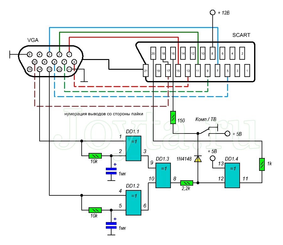 Схема переходника VGA SCART построена на интегральной микросхеме 74HC86 (четыре логических элемента «Исключающее ИЛИ»). Также требуется наличие внешнего источника питания 5В. Сигналы смешиваются при помощи элементов исключающее ИЛИ, на выходе которого получается композитный сигнал отличного качества. Переходник работает с любым телевизором, обеспечивает отрицательный сигнал на частоте 15кГц.