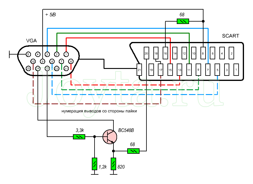 Основной сигнал, который передается по кабелю от компьютера к телевизору, это RGB сигнал с разбивкой на три составляющие (R-красный, G-зеленый, B-синий) К счастью, в данном случае стандартный разъем VGA и разъем SCART полностью совместимы (выходы: амплитуда 0,7В, сопротивление 75-го Ом). Поэтому вы можете напрямую подключить соответствующие контакты, не прибегая к использованию специальных схем или устройств (позже рассмотрим и этот вариант).