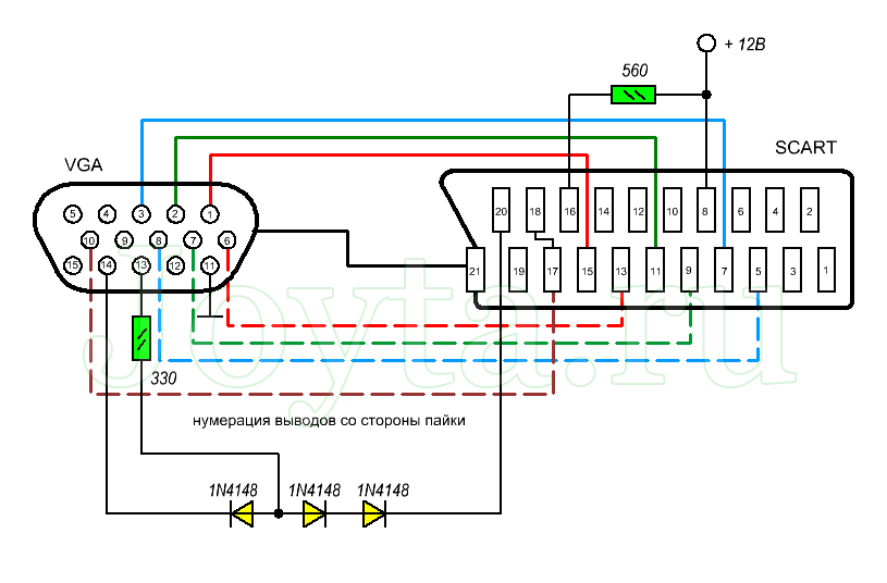 Рассмотрим первую схему переходника. В данном случае соединения линий R, G, B и массы такое же, как и у предыдущей схемы. Схема позволяет использовать обычную видеокарту (не генерирующую композитный видеосигнал). Сигналы синхронизации от контактов 13 и 14 VGA смешивают в цепи диодов 1N4148 и резистора 330 Ом, а затем передаются на обычный 20-контактный Scart.