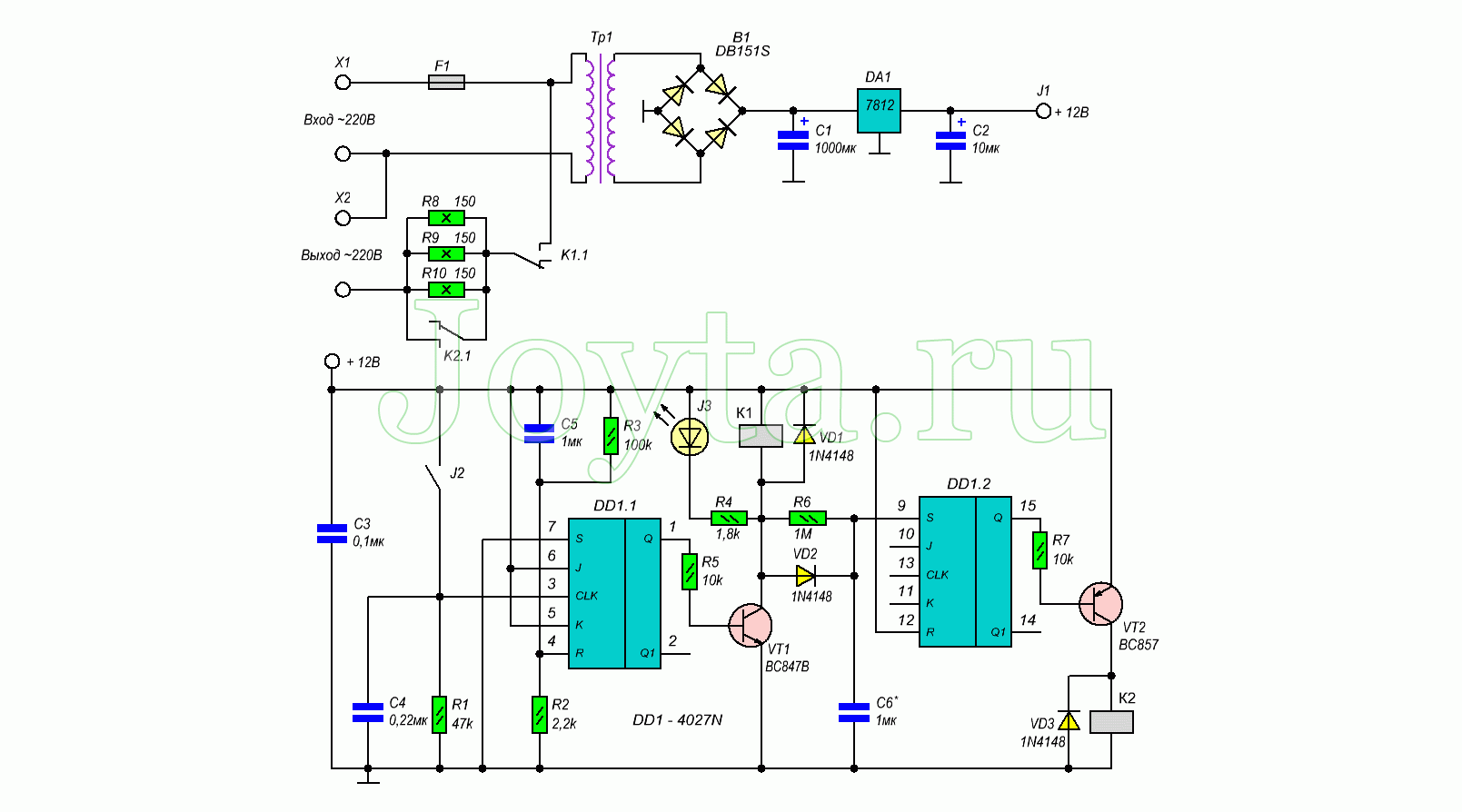 - Реле: с рабочим напряжением обмотки 9В (12В для 7812) и контактной группой соответствующей мощности.