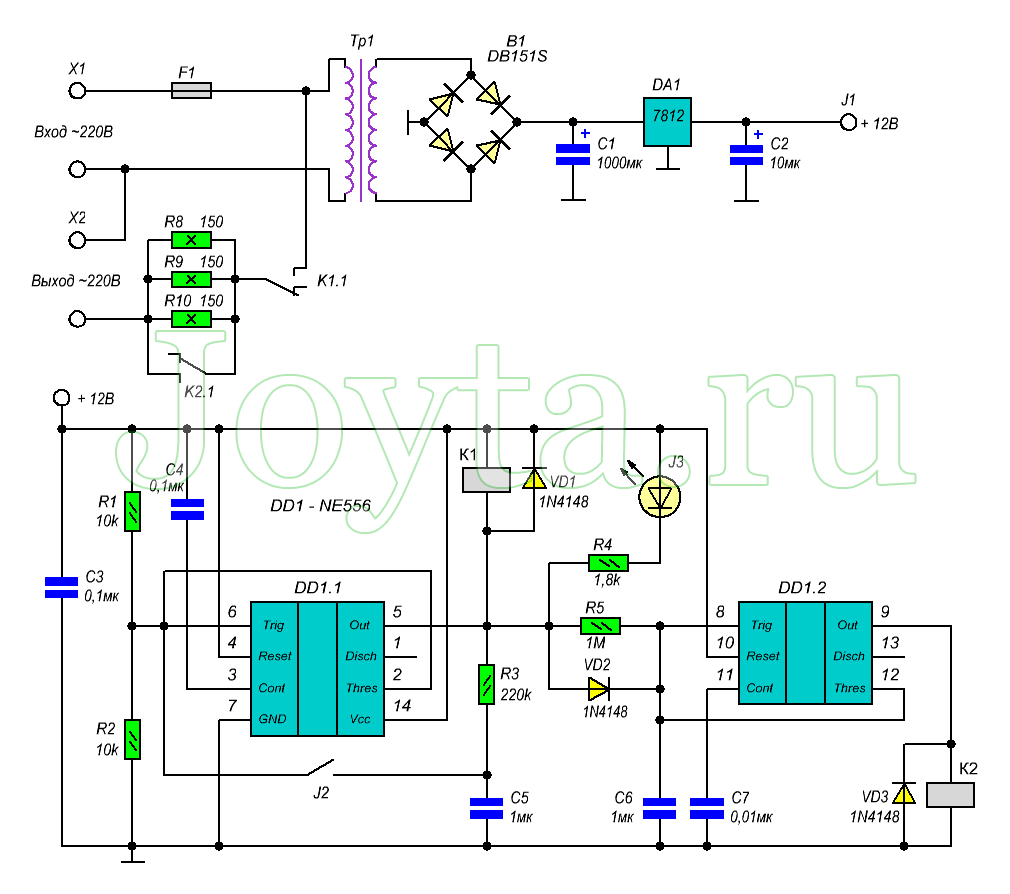 Вторая схема использует сдвоенный таймер NE556. Первый таймер используется как кнопочный выключатель, а второй как выключатель, связанный с задержкой созданной элементами R5, VD2 и C6.