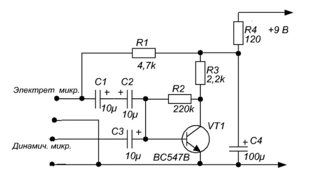 Данная схема микрофонного предусилителя работает как с динамическим, так и с электретными микрофонами.
