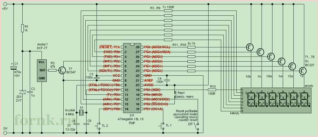 Ниже приведена схема аналогичных часов, имеющие индикатор с общим катодом