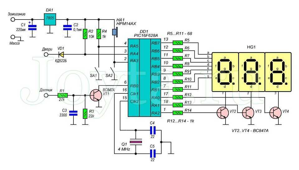 Текущее значение времени и температуры происходит поочередно сначала время а потом температура с нтервалом в 4 секунды. Формат отображения времени ЧЧ.ММ (часы,минуты). Первый ноль не отображается. О ходе отсчета времени сигнализирует мигающая точка.