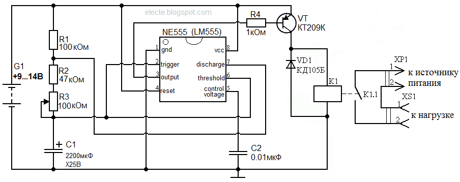 Источником питания (для силовой части со стороны реле) может быть например сеть 220В но не обязательно можно и аккумулятор и много чего. Нагрузкой может быть прибор (вентилятор, лампа и др.) подробнее о нагрузке ниже. Реле включается и замыкает источник питания на нагрузку только тогда когда на выходе микросхемы будет низкий уровень напряжения, вытекающий ток из базы транзистора VT1 станет достаточным для того чтобы этот транзистор вошел в насыщение этот транзистор не перегорит так как у обмотки реле достаточное активное сопротивление для того чтобы ток через транзистор был меньше предельно допустимого для КТ209К: Если использовать схему выше то длительность работы прибора, подключенного через реле к питания, нельзя сделать больше времени когда прибор не работает. Если нужно чтобы прибор дольше работал то можно использовать схему: