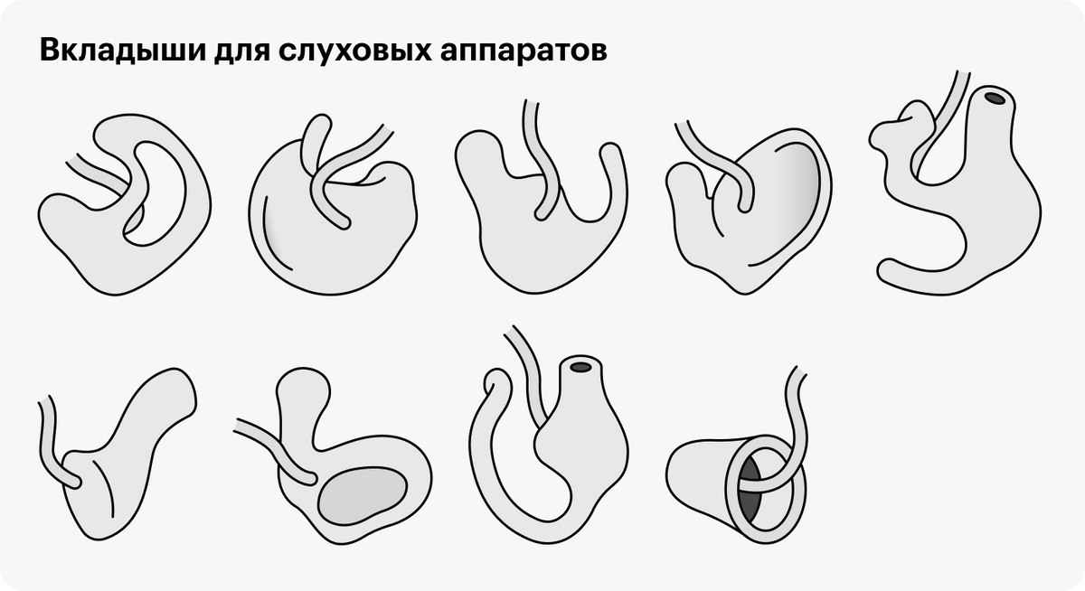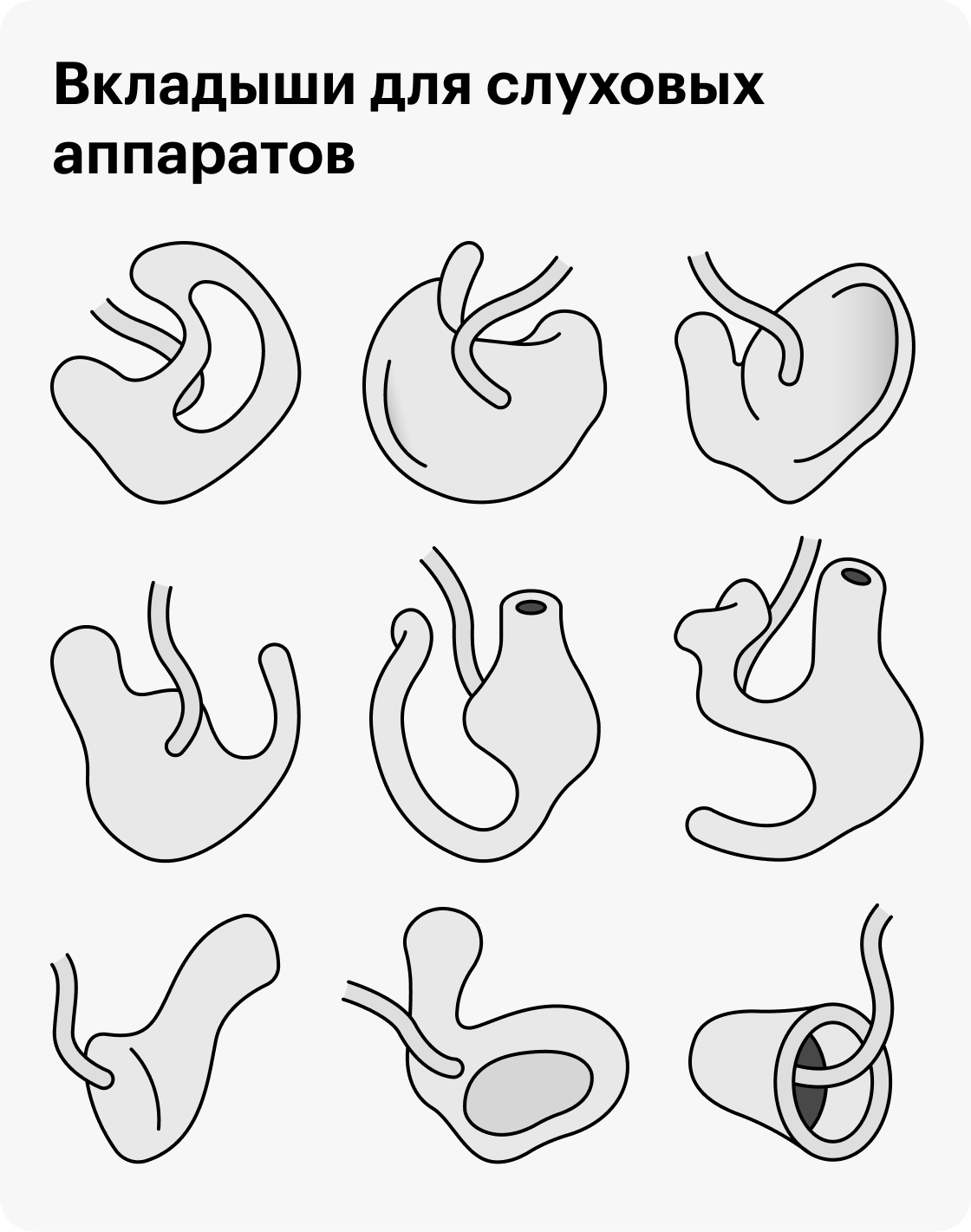 Ушной вкладыш для слухового аппарата. Он улучшает разборчивость речи. Их делают индивидуально, так как стандартный вкладыш постоянно выпадает, пользоваться им некомфортно. Форма ушного вкладыша и материал, из которого его делают, зависят от степени снижения слуха, особенностей слухового прохода, модели слухового аппарата.