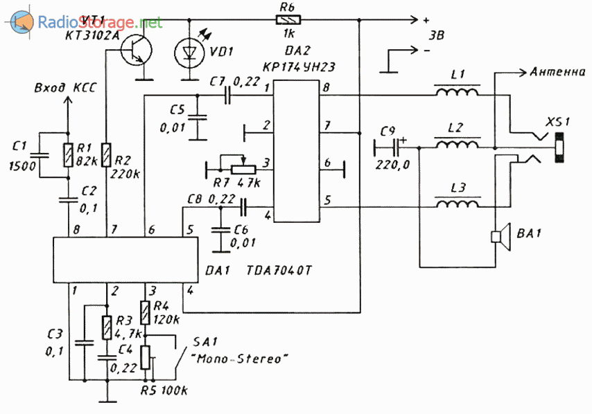 Существенным преимуществом этой микросхемы перед TDA7050T являются повышенная выходная мощность, что позволяет подключать динамическую головку, и возможность регулирования громкости по двум каналам одним переменным резистором с линейной характеристикой.
