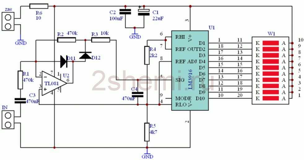 Эта схема — простой индикатор уровня, построенный на основе популярной и недорогой микросхемы LM3916. Устройство отлично подойдёт для микшера, усилителя или другой аудио аппаратуры. Оно позволяет вести визуальный контроль уровня звукового сигнала, благодаря чему мы можем избежать перегрузок и связанных с ними искажений.