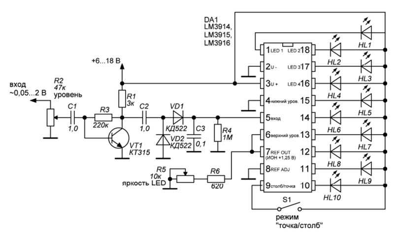 Конечная схема светодиодного индикатора уровня получится приблизительно такой.