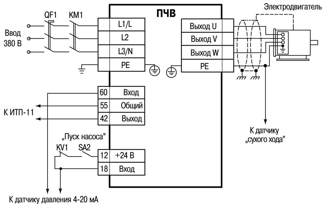 Схема электрических соединений шкафа управления насосным оборудованием ОВЕН ШУН 1. Благодаря использованию фирменных частотных преобразователей ОВЕН экономия электроэнергии достигает 35%