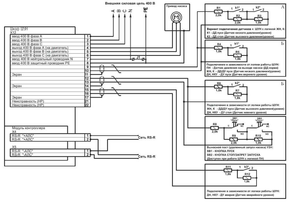 Образец подключения модели ШУН-0.18-15 (для дренажного или пожарного насоса) от производителя Рубеж с одним приводом и контроллером, регулирующим работу оборудования (+)