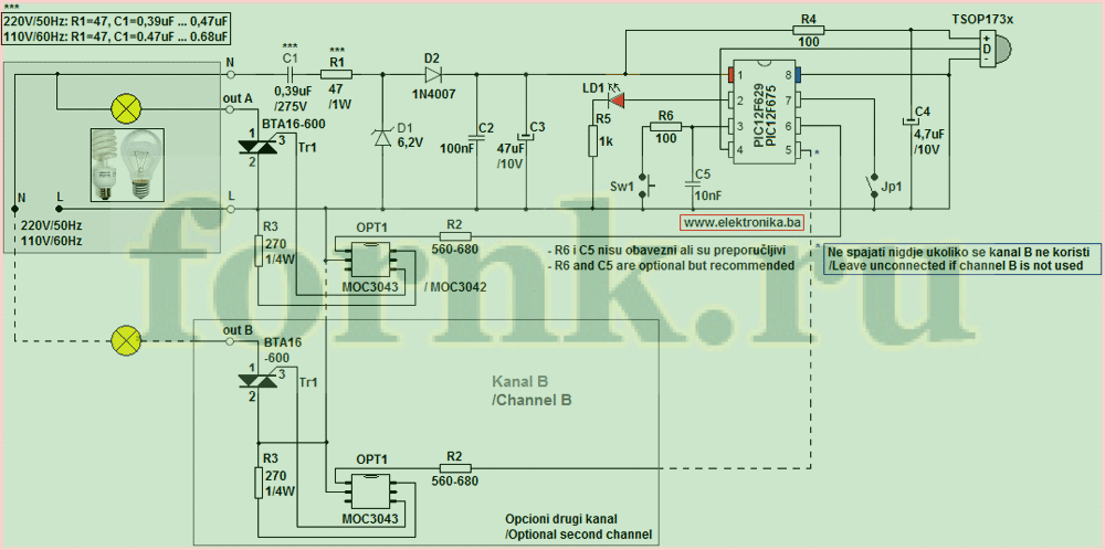 Если мы посмотрим на принципиальную (часть источника питания) мы можем увидеть, что когда симистор включается, то он замыкает наш бестрансформаторный источник питания. В этот момент вся цепь питается от конденсатора С3. Он должен быть достаточно большим, чтобы поддерживать достаточную мощность для TSOP (~5 мА), микроконтроллера (< 1 мА) и MOC3023 (~ 5 мА, но только в течение нескольких микросекунд). Поэтому здесь желательно поставить конденсатор С3 большой емкости: 220 мкФ / 330 мкФ / 470 мкФ.