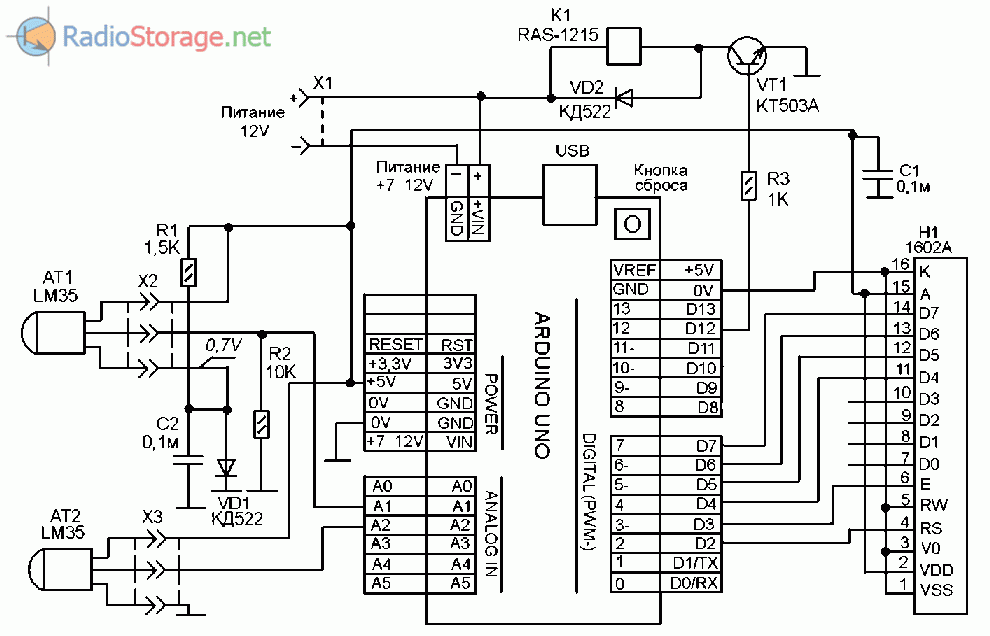 Напряжения с термодатчиков АТ1 и АТ2 поступают на два аналоговых входа А1 и А2. Всего аналоговых входов шесть, — А0-А5, можно было выбрать любые два из них. В данном случае, выбраны А1 и А2. Для управления греющим кабелем используется цифровой выход D12.