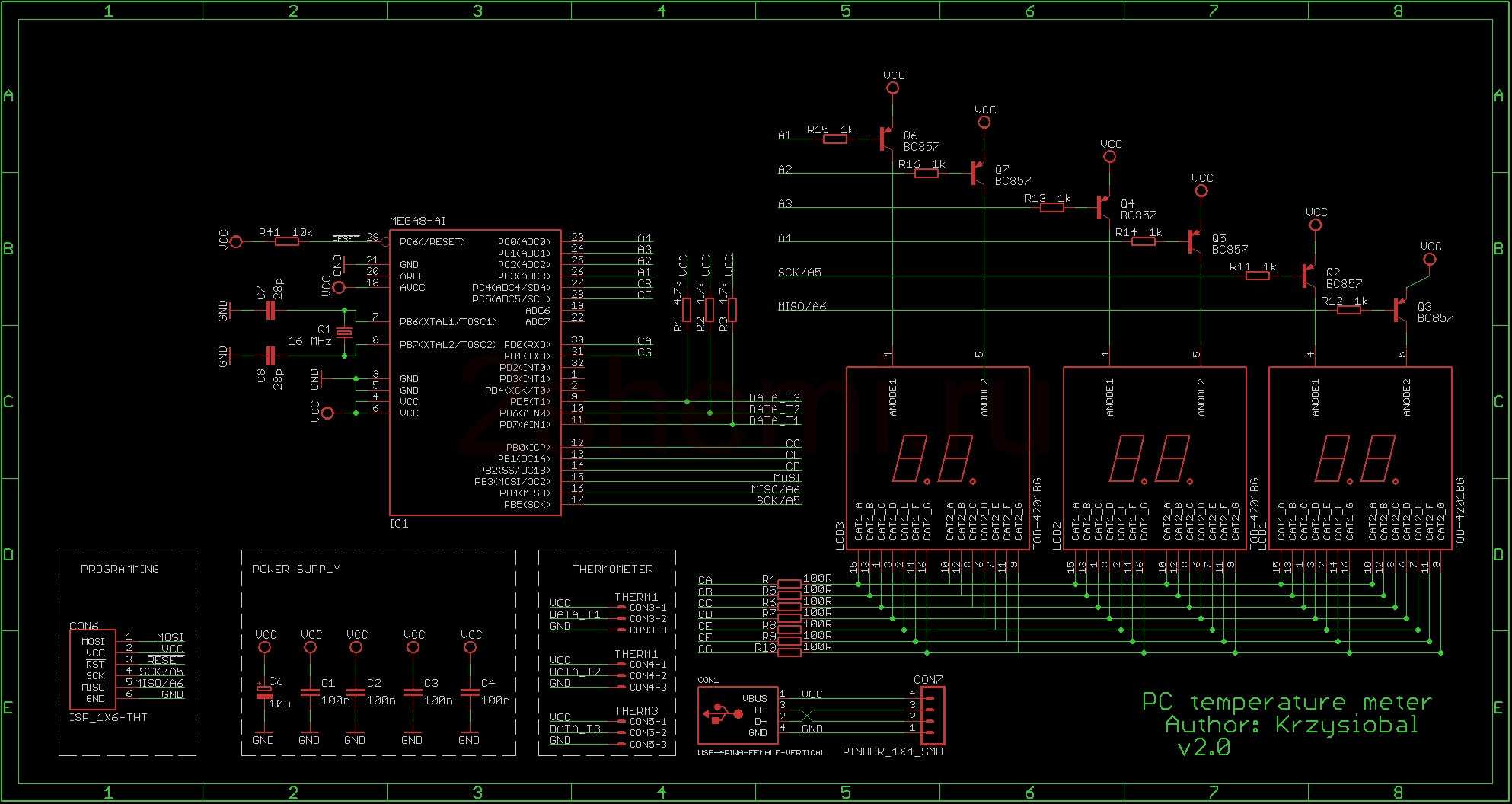 AVR Atmega 8 в миниатюрном корпусе TQFP32 идеально подходит для такого типа проектов, в качестве датчиков температуры были выбраны DS18B20, работающие по шине 1-W3ire.