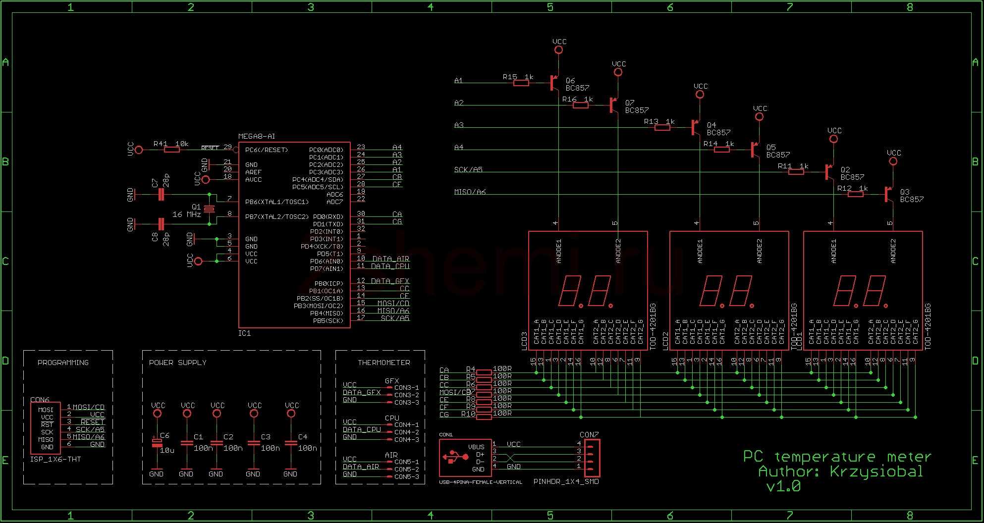 Для управления анодами дисплея использовал транзисторы PNP BC857 (IcMAX = 100 мА, IcPeak = 200 мА) в корпусе SOT23 (каждый сегмент дисплея имеет фиксированный ток при Iseg = 20 мА: Rcathode = (VCC — VGreenLed) / Iseg = (5V — 1,8V) ) / 20 мА = 160R = ~ 150R (т.е. Iseg = ~ 21 мА).
